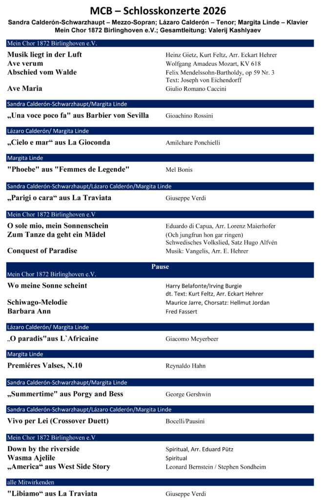 Am 29. und 30. Mai ist es wieder so weit – Schloss Birlinghoven öffnet im 53. Jahr seine Türen für die Besucher der beliebten Schlosskonzerte des MCB. Chorleiter Valerij Kashlyaev hat erneut ein abwechslungsreiches Programm zusammengestellt mit Liedern von Klassik bis Pop, von geistlich bis Unterhaltung, von Oper bis Musical.