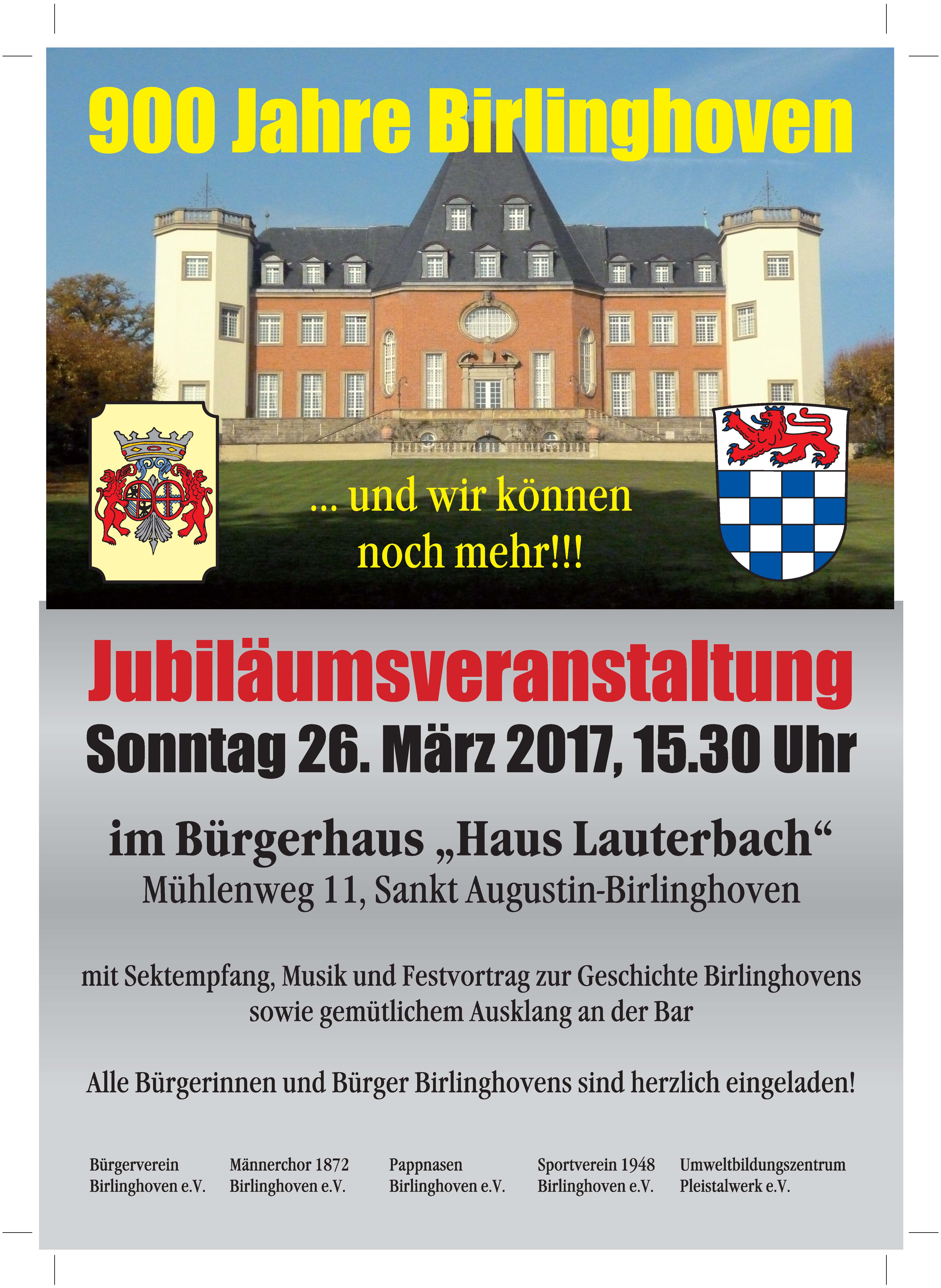 Vor nunmehr 900 Jahren wurde der Ort Birlinghoven erstmals urkundlich erwähnt. Aus diesem Grunde finden in 2017 mehrere gemeinsame Veranstaltungen aller ortsansässigen Vereine statt. Auftakt ist am 26. März im Haus Lauterbach mit Empfang, Grußworten der Politik, Chorauftritt und Festvortrag.